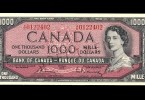 Le billet de 1 000 dollars de la série de 1937 a été émis plusieurs années après les autres coupures. Pourvu du même rose que le billet de 20 dollars de 1935, il conserve toutefois l’effigie de sir Wilfrid Laurier. -
