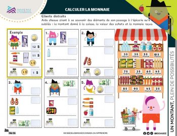 Durant cette activité, les élèves calculent le montant d’argent nécessaire pour des opérations simples et la monnaie rendue quand on paie avec une pièce de monnaie ou un billet de banque de valeur supérieure. La première activité fait appel à des montants en dollars et la deuxième, à des montants de moins d’un dollar.
