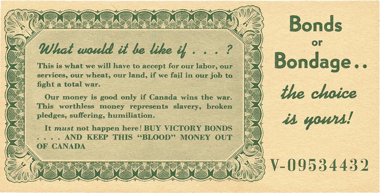 Le verso des billets de l’opération « Si un jour... » indiquait leur véritable objectif : « Achetez des obligations de la Victoire [...] pour éviter que le Canada ait à utiliser cette monnaie entachée de sang. »