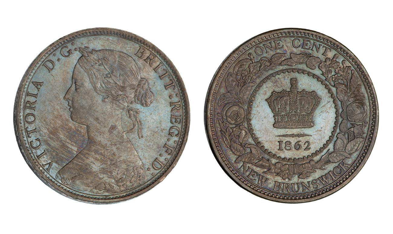 En 1861 et 1864, la Monnaie royale de Londres a frappé des pièces de circulation de 1 cent pour le Nouveau-Brunswick. À deux exemplaires connus seulement, cette pièce de 1862 aurait été fabriquée pour être incluse dans un boîtier de présentation pour cette année-là.