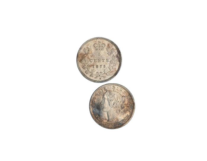 Cette pièce de l’atelier monétaire Heaton (d’où la lettre « H » de l’atelier au bas sur le revers) est probablement une autre pièce de présentation. Heaton avait été engagé en sous-traitance par la Monnaie royale pour frapper des pièces. Comme le Nouveau-Brunswick faisait déjà partie du Canada en 1875, il n’était pas nécessaire que la pièce soit mise en circulation.