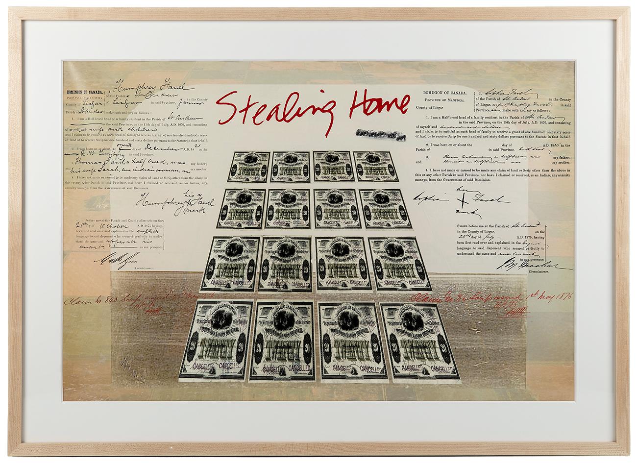 Cette année, le Musée a fait l’acquisition de Stealing Home, une œuvre de l’artiste métisse Rosalie Favell. Cette œuvre d’art raconte l’histoire du système d’octroi de bons fonciers aux Métis – un système géré par le gouvernement du Canada de 1870 à 1920. Les bons fonciers étaient pour le gouvernement la solution de rechange aux traités visant les communautés métisses du Manitoba et des Prairies : c’était un moyen d’enlever aux Métis leurs droits fonciers autochtones à leurs terres ancestrales pour que celles-ci puissent être colonisées par les Blancs. Le système était mal administré, et de nombreuses familles métisses ont perdu leurs terres. Ce système a eu des conséquences culturelles et économiques dévastatrices pour les Métis, à la différence des spéculateurs fonciers et des banques commerciales qui en ont bien profité. L’œuvre de Rosalie Favell témoigne de cette histoire marquante à travers le regard que pose l’artiste sur l’expérience vécue par sa propre famille.