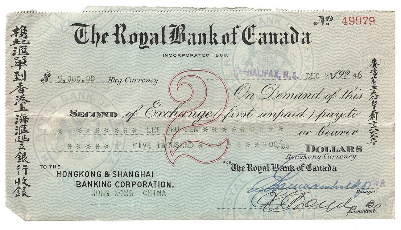 Source : $5,000, lettre de change, Canada, Hong Kong, Banque Royale du Canada, 1946