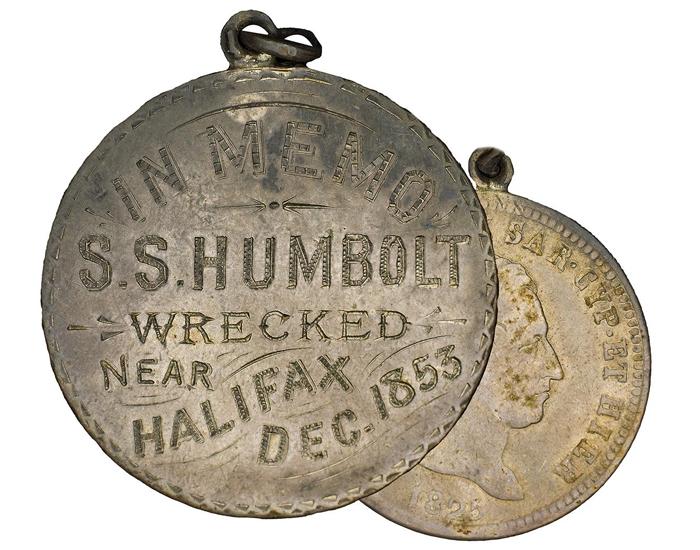 Le S.S. Humboldt , un navire à vapeur américain, s’est échoué sur des hauts-fonds alors qu’il rejoignait l’entrée du port d’Halifax dans un épais brouillard. L’inscription sur ce jeton d’amour se lit : « IN MEMO S.S. HUMBOLT WRECKED NEAR HALIFAX DEC 1853 » (en souvenir du S.S. Humbolt, naufragé près d’Halifax, décembre 1853).