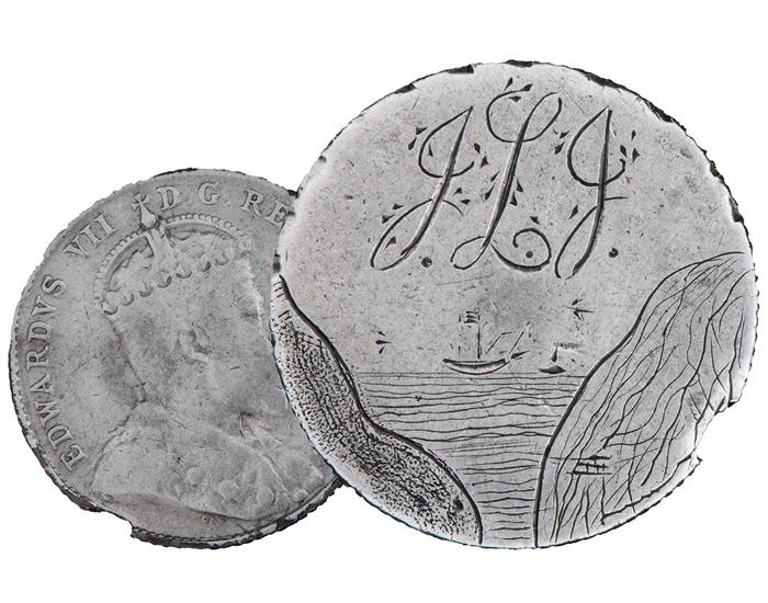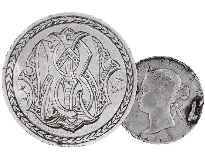 Les pièces d’argent étaient souvent utilisées à l’époque victorienne pour fabriquer des jetons d’amour. En effet, l’argent est à la fois joli et suffisamment malléable pour être facilement gravé à la main. De plus, les pièces comme les dollars américains en argent et les couronnes britanniques de cette époque étaient plutôt grandes, ce qui offrait une bonne surface de travail. On y inscrivait le plus souvent les initiales ou le nom de la personne aimée. Sur les jetons commémoratifs, on retrouvait communément, en plus des initiales, d’autres éléments tels que des dates, des lieux et des images. Il n’est pas rare de trouver des jetons d’amour percés ou munis d’un œillet ou d’une épingle, ce qui permettait à leur propriétaire de les porter avec fierté. Par ailleurs, les pièces de monnaie locales n’étaient pas les seules à être transformées. Des jetons d’amour canadiens ont été fabriqués à partir de pièces provenant de partout en Europe, et même d’Égypte!