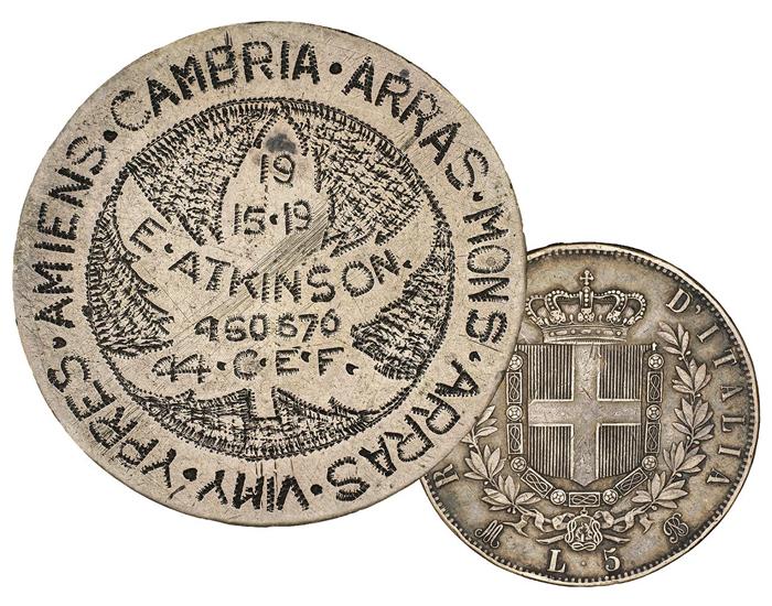 Source : jeton d’amour, Edward Atkinson, Canada, vers 1919 / 5 lires, Italie, 1861-1878 | 1972.49.6