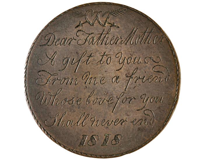 Âgé de 15 ans, John Campling a adressé ce message à ses parents avant d’être déporté en Australie pour avoir volé une montre. Il a peut-être payé quelqu’un pour créer cet élégant jeton. L’inscription signifie ce qui suit : Chers père et mère, voici un cadeau de ma part, un ami qui vous aimera toujours, 1818.