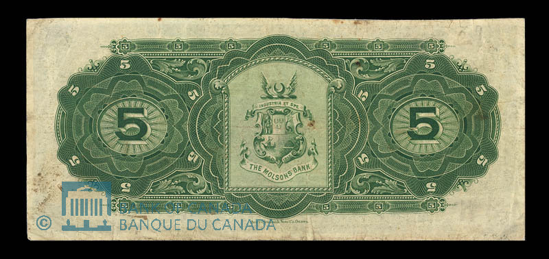 Canada, Molsons Bank, 5 dollars : 2 janvier 1908